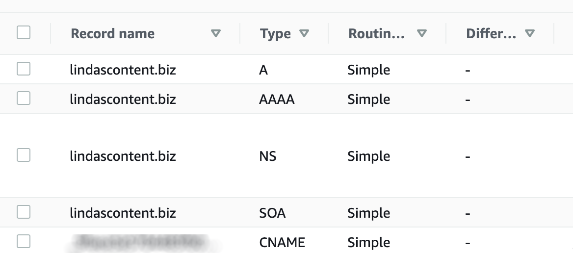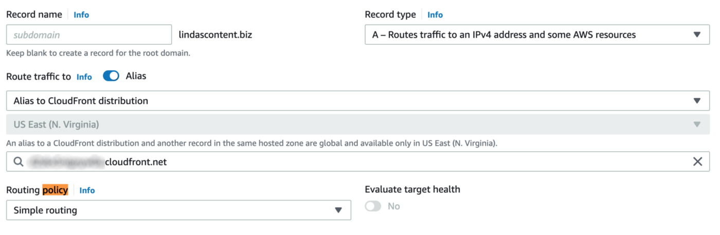 Your A and AAAA records should now have the “Alias” option turned on, which creates a dropdown that includes your CloudFront distribution, which should be selected in those two records.This is an example “A” record following the linked docs. The “AAAA” record is similar.