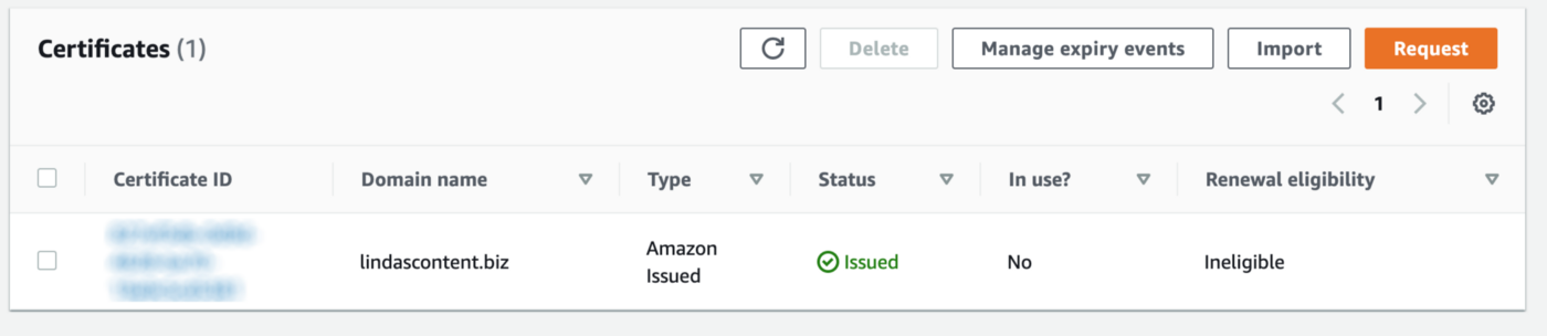 Certificate Manager home pageCertificate Manager will add a CNAME record matching your certificate (see blurred line). Make sure to click on the button for doing this, when requesting your certificate. This image is from the Route 53 hosted zone.