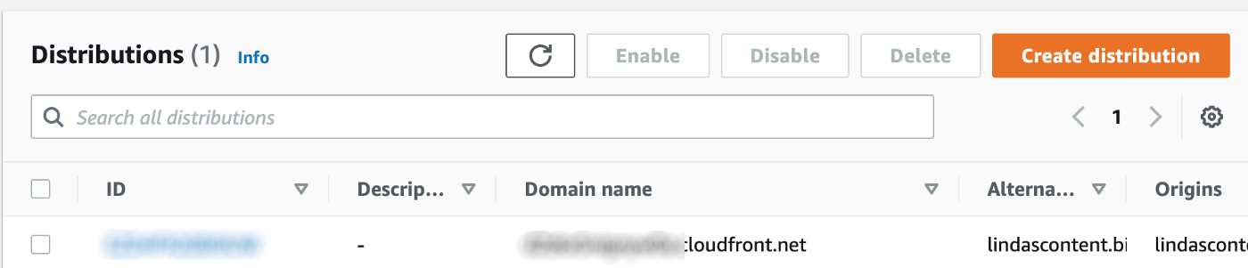 Main “Distributions” page has “Create Distribution” buttonThe OAI from the CloudFront distribution’s origin should match what’s in the S3 bucket policy (the blurred part)